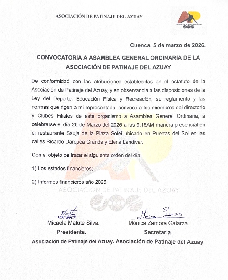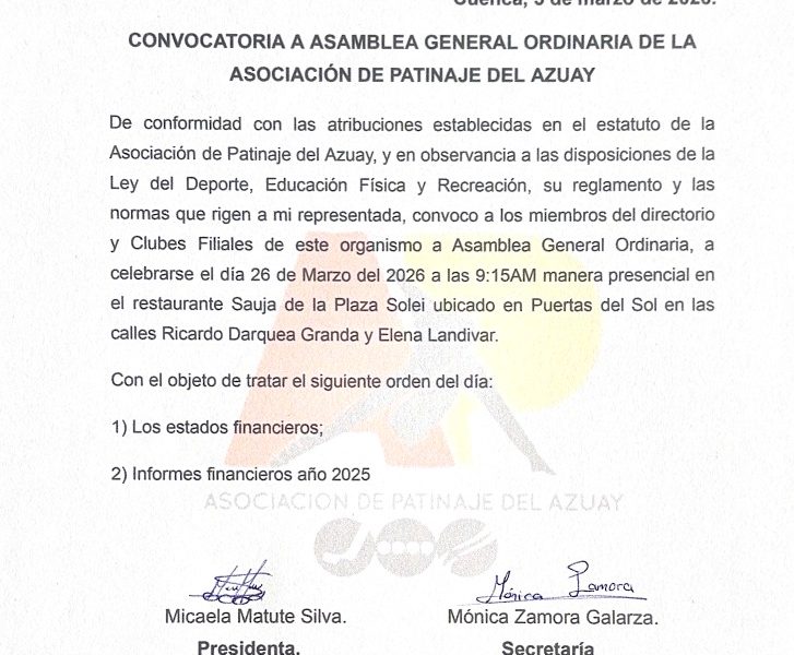 05/03/2026Publicado por Milton Rocano el 05/03/2026Convocatoria a Asamblea General Ordinaria de la Asociación de Patinaje del Azuay