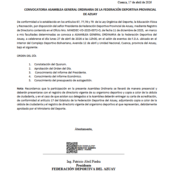 Convocatoria para la Asamblea General de Elecciones de la Asociación de Ciclismo del Azuay