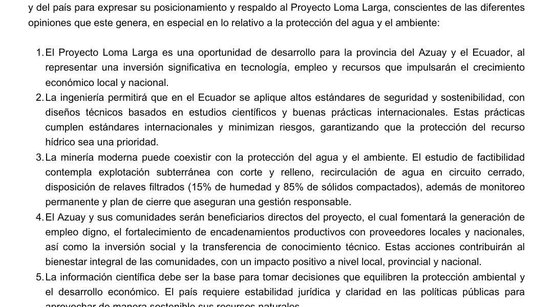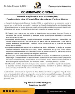 La AIME reafirma su respaldo al Proyecto Loma Larga, destacando que la minería moderna y responsable Publicado por Milton Rocano el 03/09/2025 Compartir1 Milton Rocano Articulos relacionados16/04/202610 años después del terremoto el verdadero desafío es construir mejor el EcuadorLeer mas16/04/2026Pronósticos deportivos en Ecuador: millones en juego y una regulación que no llegaLeer masPatinadores de la Escuela Pesántez Bisanti, Cuenca15/04/2026Destacada actuación de deportistas en la Copa de Escuelas de Patinaje ArtísticoLeer mas