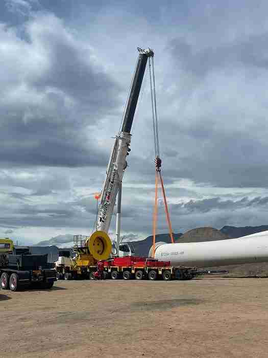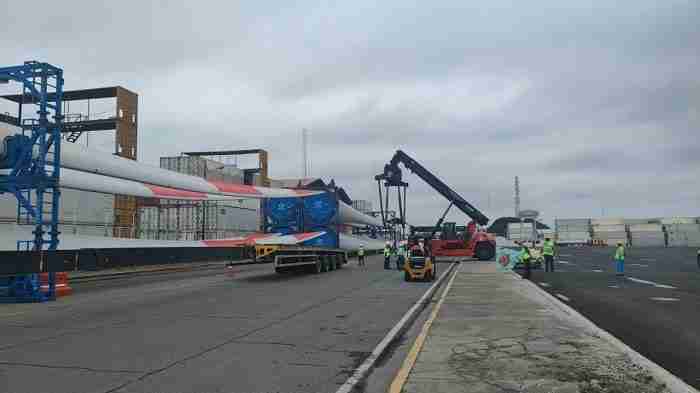 El envío de estas enormes piezas, que llegaron en un buque especial, ha sido todo un desafío por la magnitud. Cada pala tiene 72,6 m de longitud y 23 toneladas de peso.