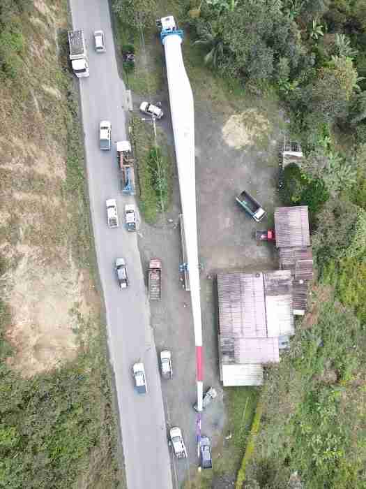 Las enormes palas del proyecto eólico Huascachaca se están trasladando a Loja, en el sur del país. Las piezas que llegaron semanas atrás a las instalaciones de Yilport en Puerto Bolívar, en El Oro, se han empezado a transportar vía terrestre hasta Loja.