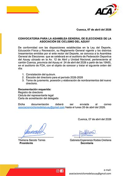 08/04/2026Publicado por Redacción el 08/04/2026Convocatoria para la Asamblea General de Elecciones de la Asociación de Ciclismo del Azuay