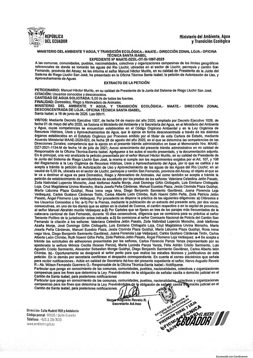 Aviso administrativo MAATE – Trámite de aprovechamiento de agua en Santa Isabel