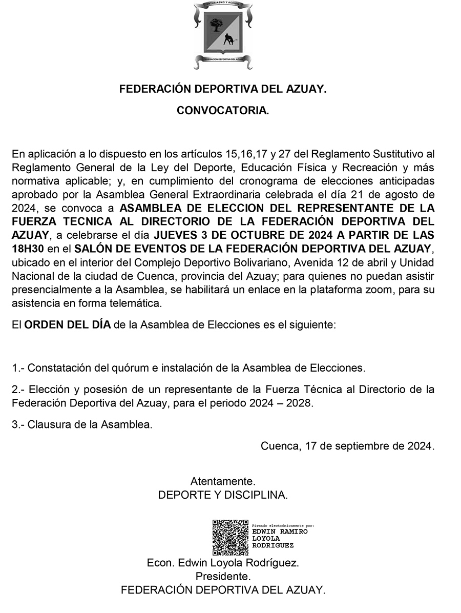 Convocatoria a Asamblea de Elección del Representante de la Fuerza Técnica al Directorio de la Federación Deportiva del Azuay – Octubre 2024 Publicado por Redacción el 17/09/2024 Compartir0 Redacción