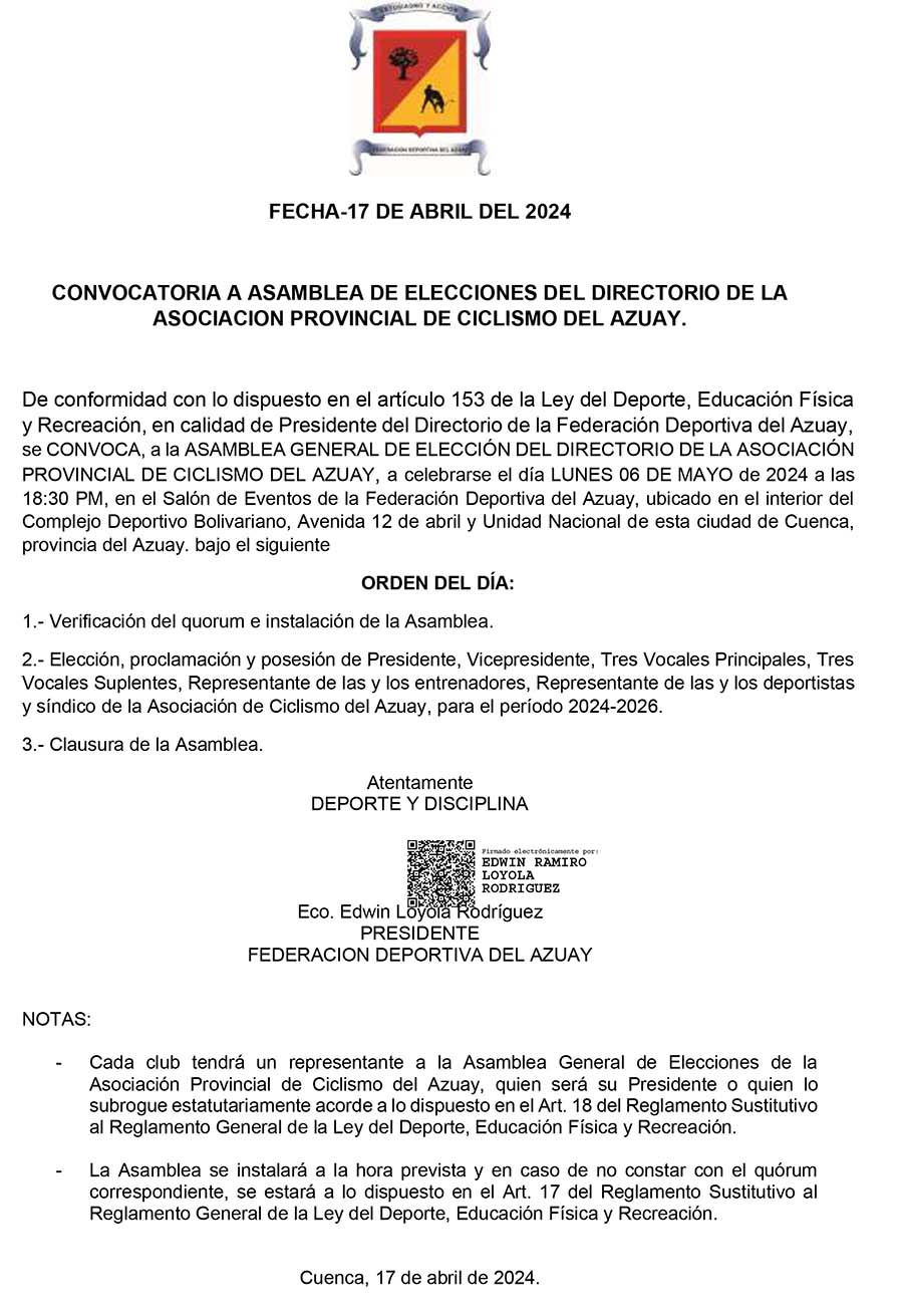 Convocatoria a Asamblea de Elecciones del Directorio de la Asociacion Provincial de Ciclismo del Azuay Publicado por Redacción el 17/04/2024 Compartir0 Redacción