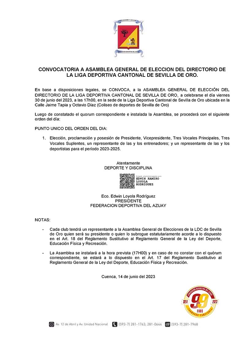 Convocatoria a asamblea general de eleccion del directorio de la liga deportiva cantonal de sevilla de oro.