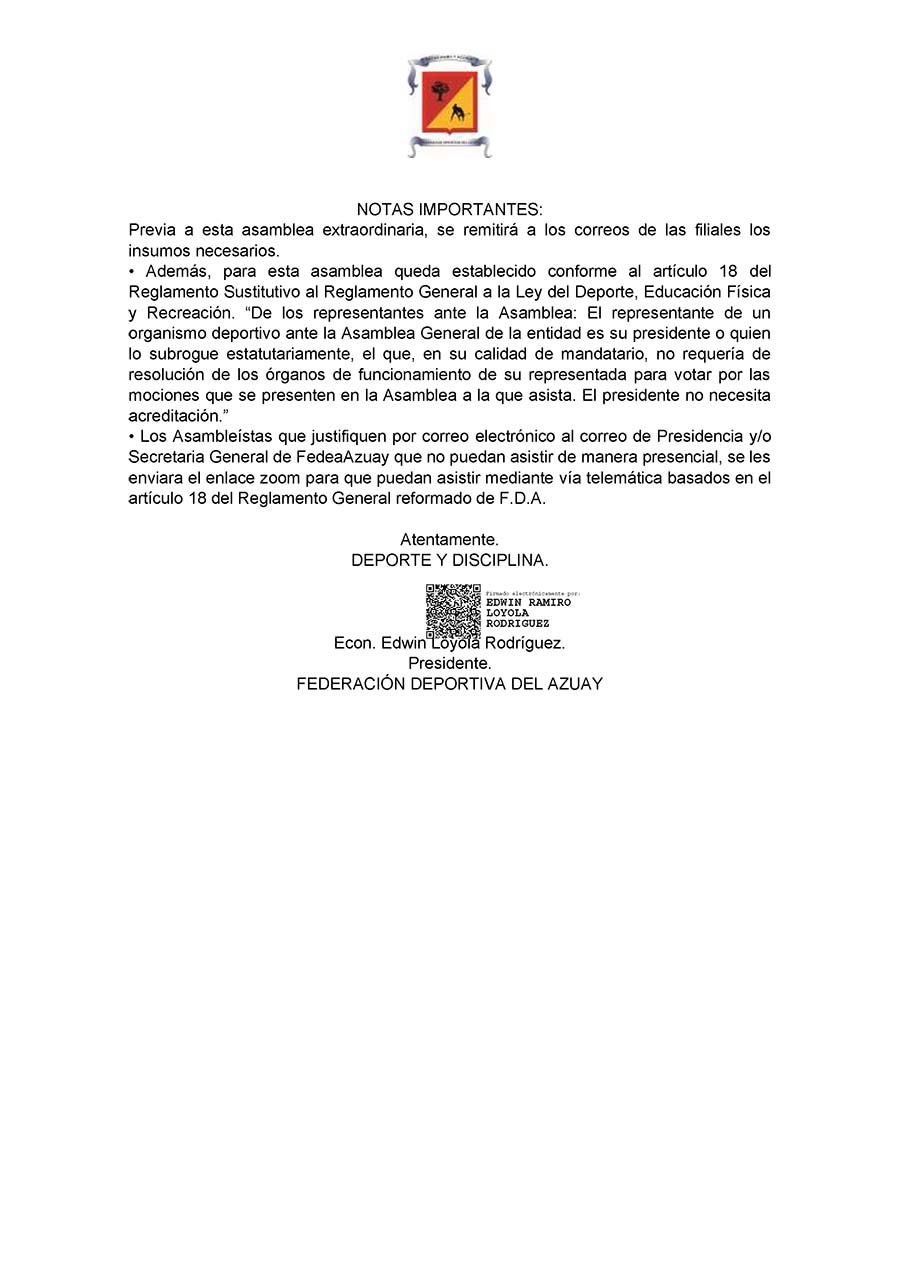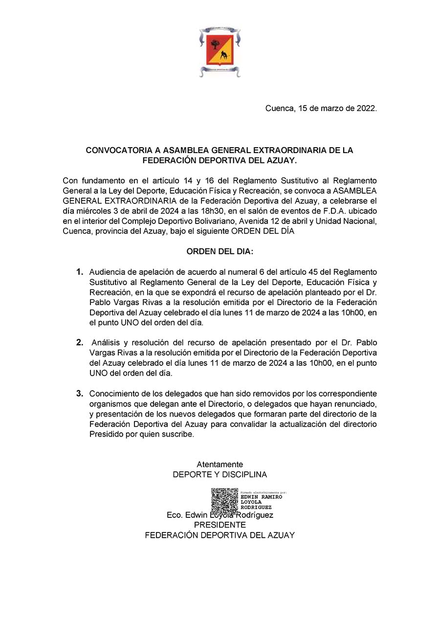 Convocatoria a Asamblea General Extraordinaria de La Federación Deportiva del Azuay Publicado por Redacción el 15/03/2024 Compartir1 Redacción