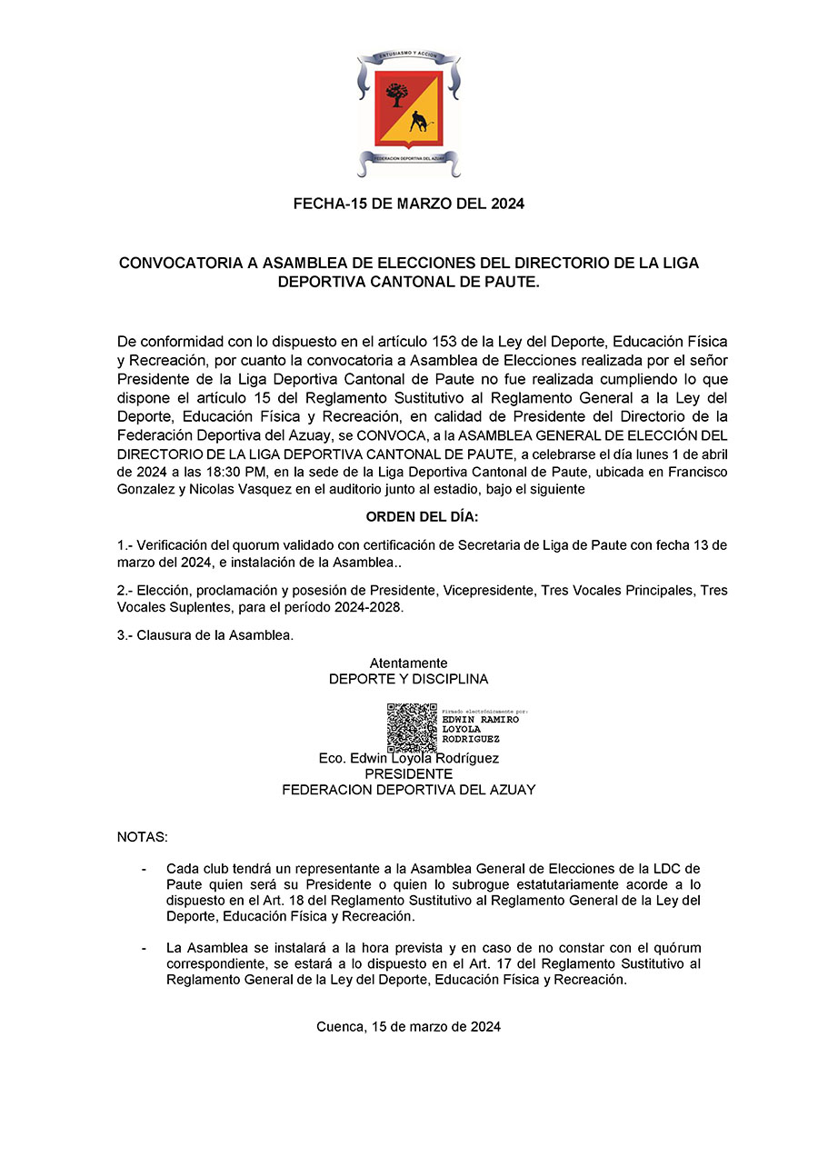 Convocatoria a elecciones del directorio de la Liga Deportiva Cantonal de Paute Publicado por Redacción el 14/03/2024 Compartir1 Redacción