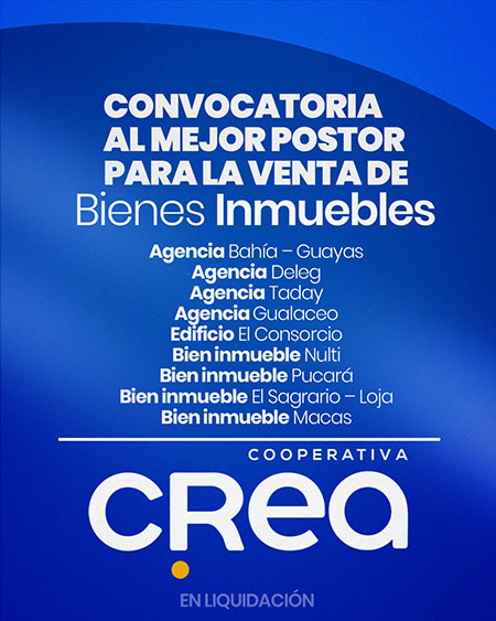 La Cooperativa de Ahorro y Crédito CREA Ltda. en Liquidación convoca a la primera oferta pública al mejor postor para la venta de varios bienes inmuebles, de conformidad con la normativa vigente emitida por la SEPS.