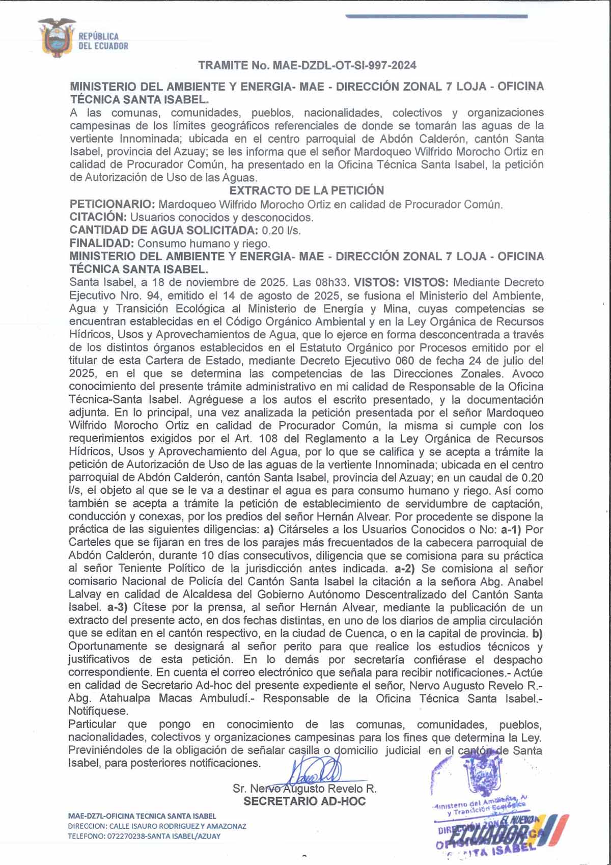 Notificación pública de trámite administrativo para autorización de uso de aguas – MAE, Oficina Técnica Santa Isabel