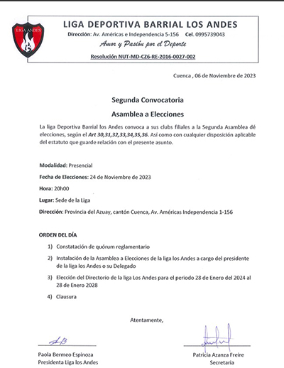 Segunda Convocatoria a Asamblea de Elecciones – Liga Deportiva Barrial Los Andes