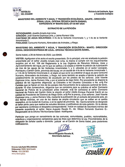 Extracto de Solicitud de Autorización de Uso de Agua por Joselito Amado Arpi Lima