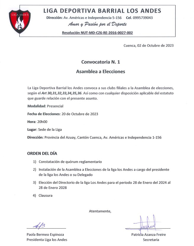 Primera Convocatoria a Asamblea de Elecciones – Liga Deportiva Barrial Los Andes Publicado por Redacción el 02/10/2023 Primera Convocatoria a Asamblea de Elecciones – Liga Deportiva Barrial Los Andes Compartir0 Redacción