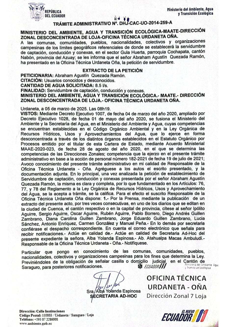 MINISTERIO DEL AMBIENTE, AGUA Y TRANSICIÓN ECOLÓGICA-MAATE-DIRECCIÓN ZONAL DESCONCENTRADA DE LOJA-OFICINA TÉCNICA URDANETA OÑA.