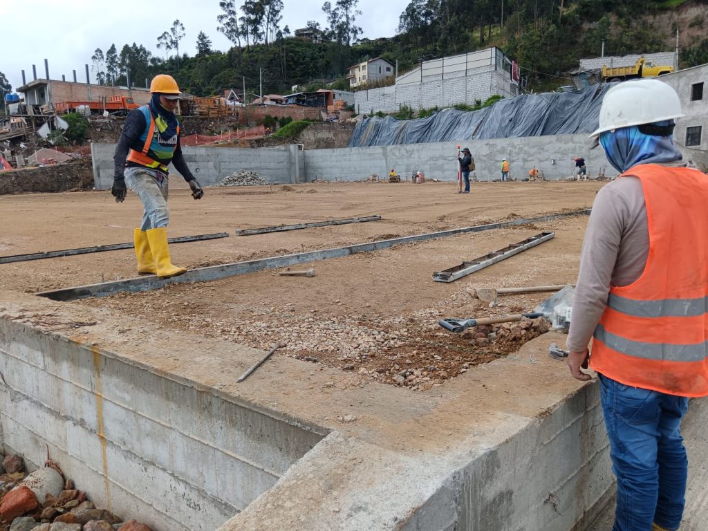 Actualmente se realiza la fundición del piso donde se ubicarán los puestos, también la conformación del área administrativa y bloque de baños. Al igual se colocará el hormigón en la zona de parqueo.