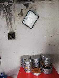 Al ingresar al área de producción del establecimiento se evidenció una moto apoyada en la percha donde se almacenaban materias primas, la infraestructura en mal estado en general era evidente: paredes y techos con manchas negras producto del moho generado por la humedad, así como falta de mantenimiento y limpieza en pisos. Al continuar la inspección se encontraron heces de roedor detrás del equipo de frio y otros espacios.