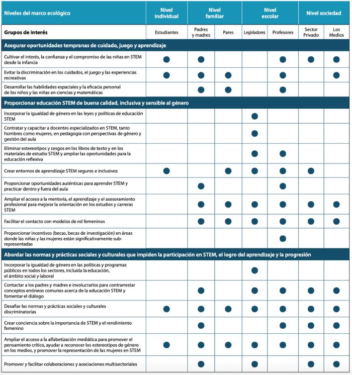 La baja tasa (7.6 por ciento) de referentes de mujeres científicas en textos y material educativo refuerza los sesgos y marca un entorno de exclusión para la participación femenina. Como respuesta a esta realidad, la iniciativa #NoMoreMatildas (relacionada a la activista Matilda Joslyn Gage), fomenta modelos positivos de mujeres científicas en los cuales las niñas puedan reflejarse. Por otra parte, es necesario transformar el sistema educativo intermedio y superior para desplegar planes de estudio sensibles al género y que sea el profesorado quienes alienten la participación de las niñas y estimulen su interés por la ciencia.
